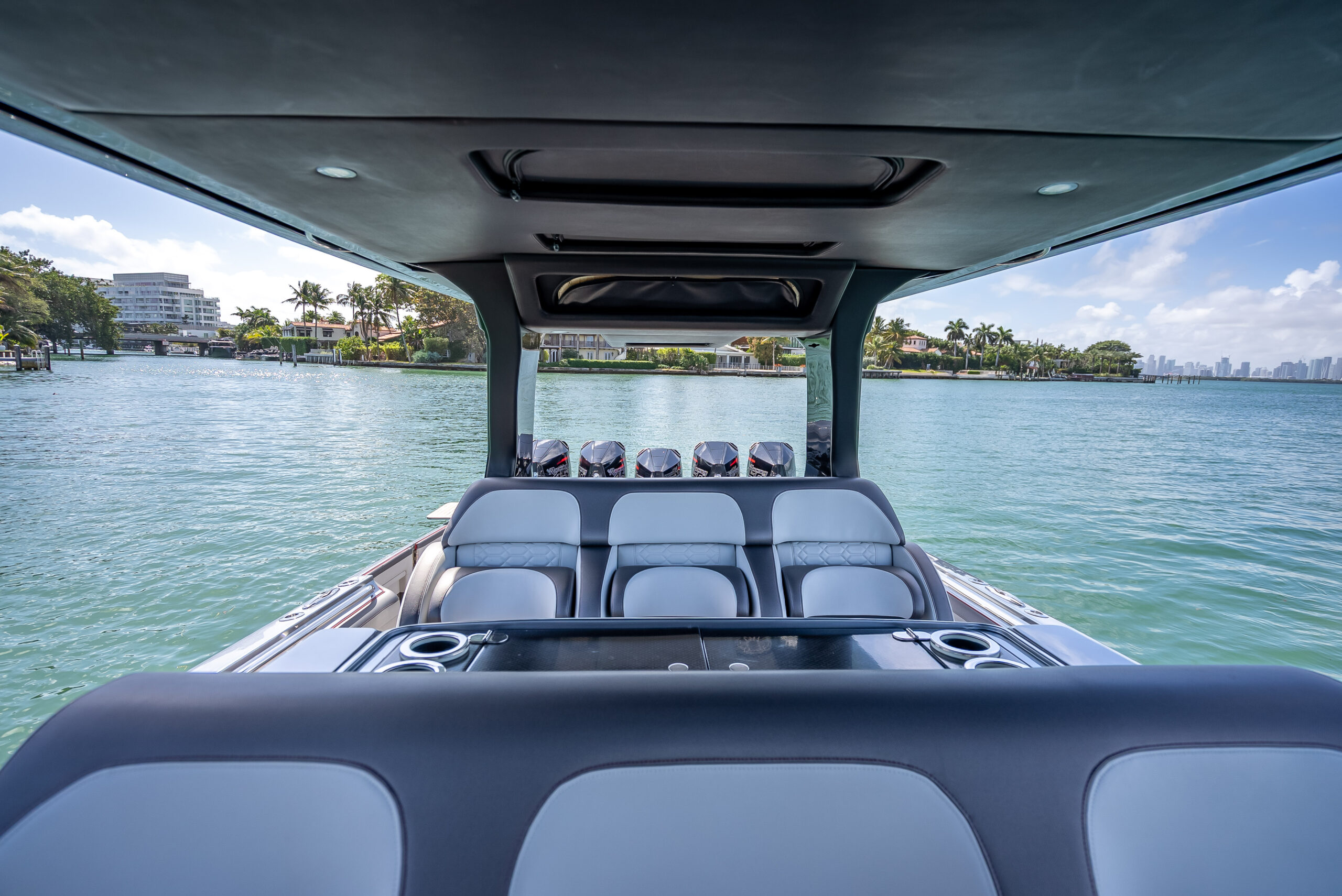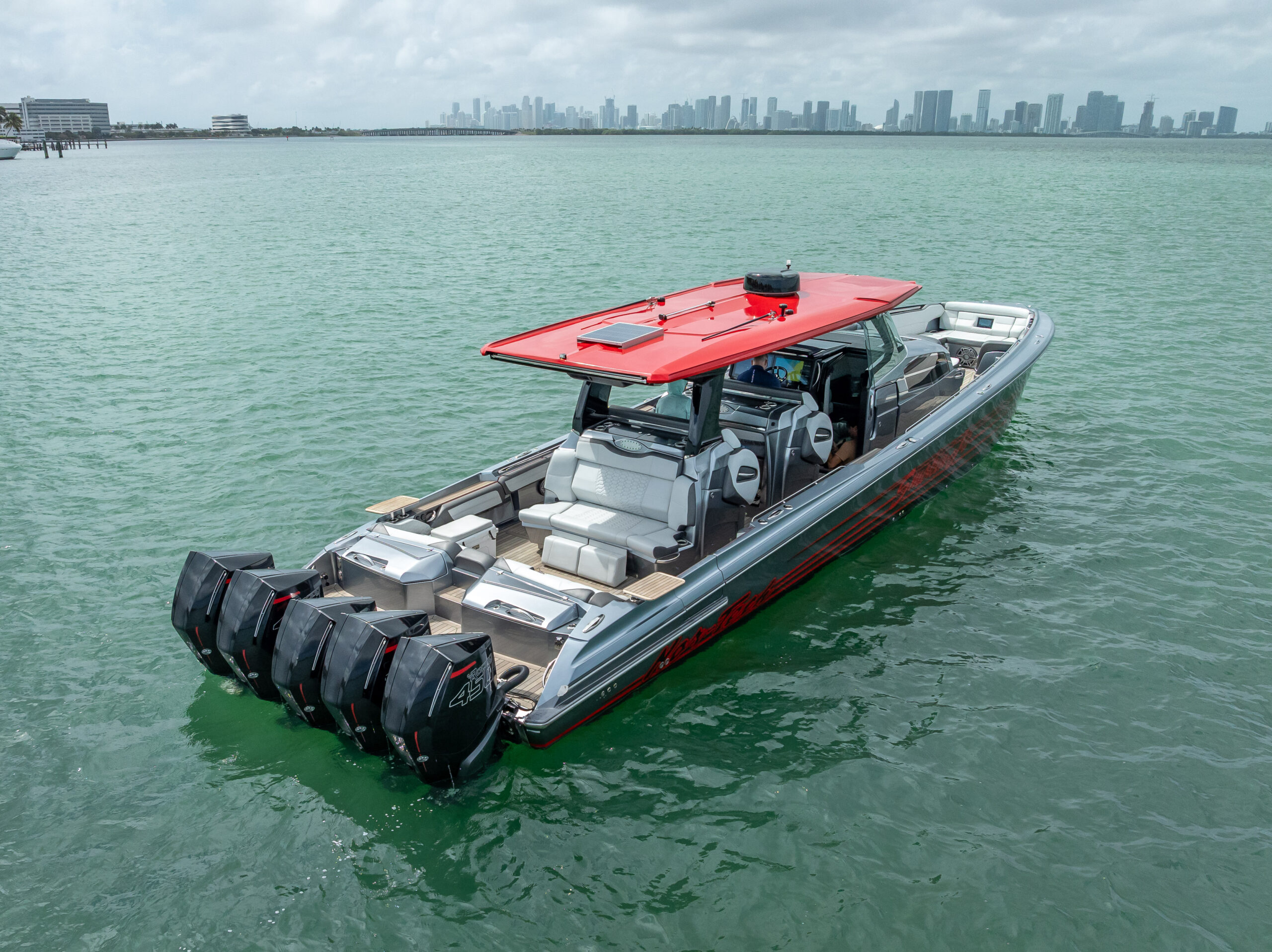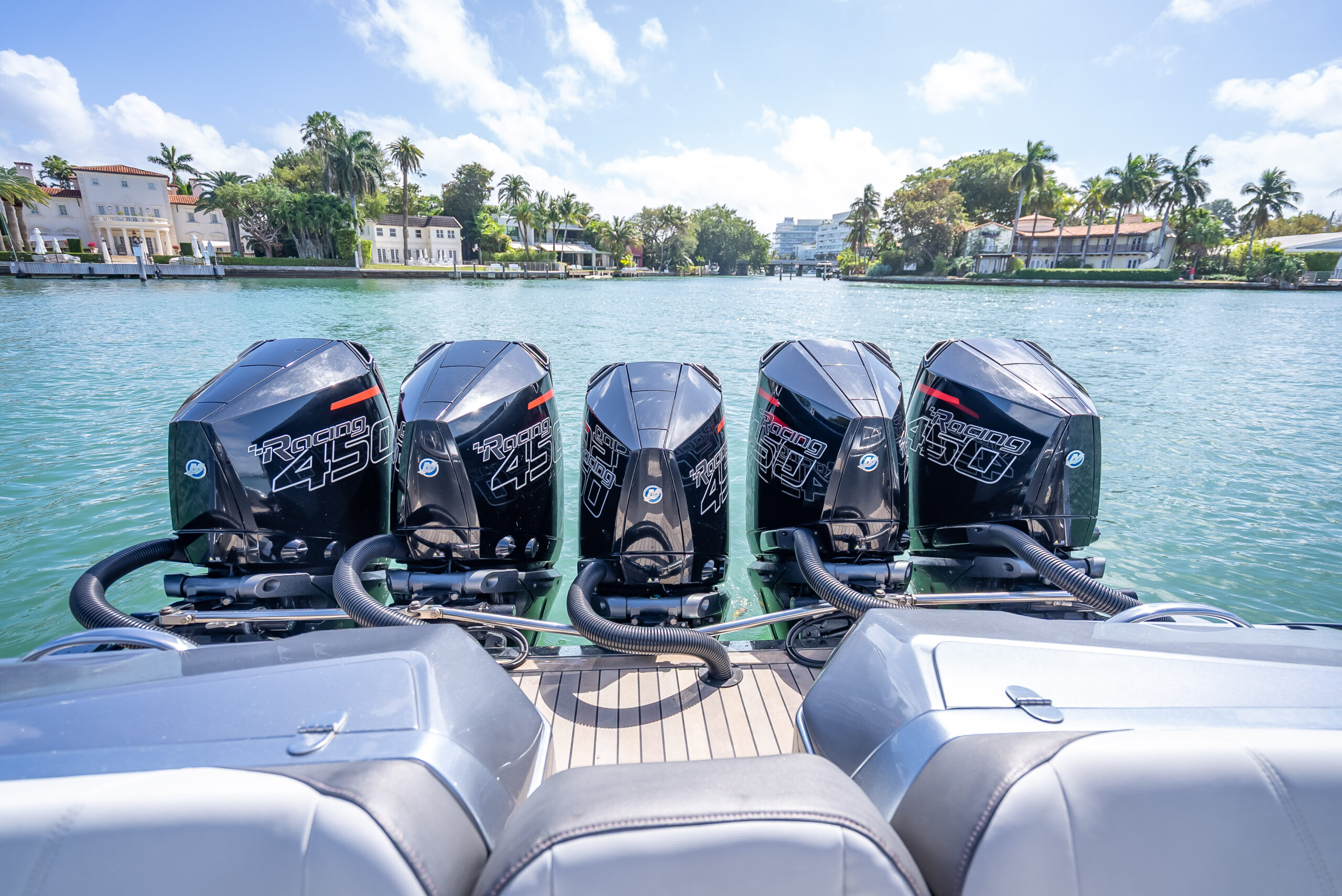 This 2022 Nor-Tech 500 Center Console is an exceptionally well-optioned, high-performance luxury vessel powered by quint Mercury Racing 450R engines and equipped with a Seakeeper 6 gyro stabilizer for unmatched ride quality.