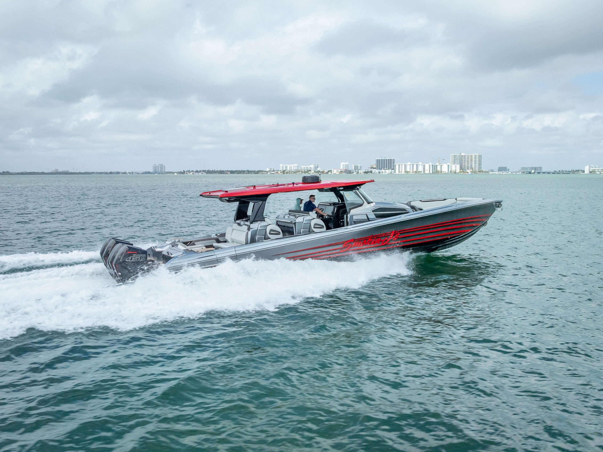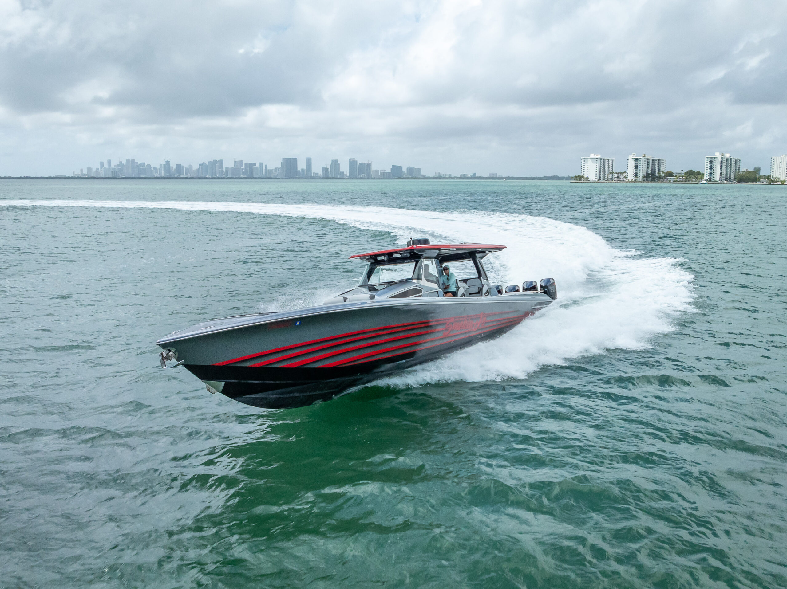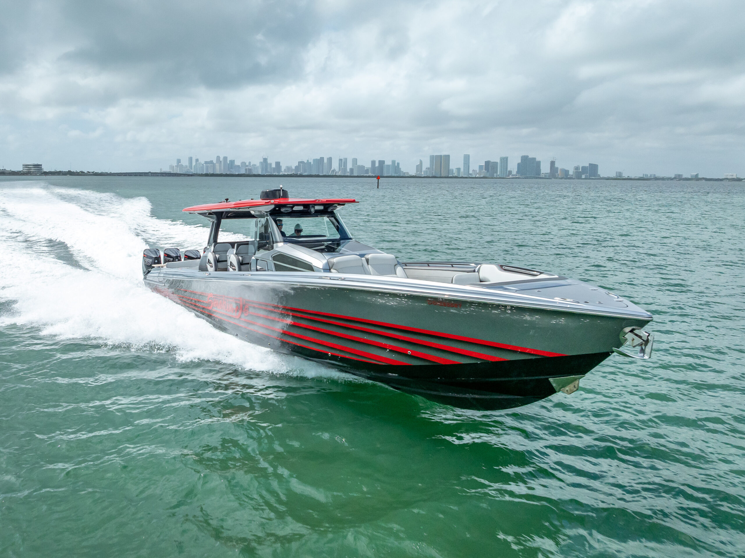 Finished with extensive custom paintwork, including painted motors and helm, this vessel stands out both at the dock and underway. The boat is fully loaded with premium options including dual 22” Garmin displays, FLIR night vision, upgraded JL Audio system, diesel generator, bow & stern thrusters, and faux teak decking throughout.